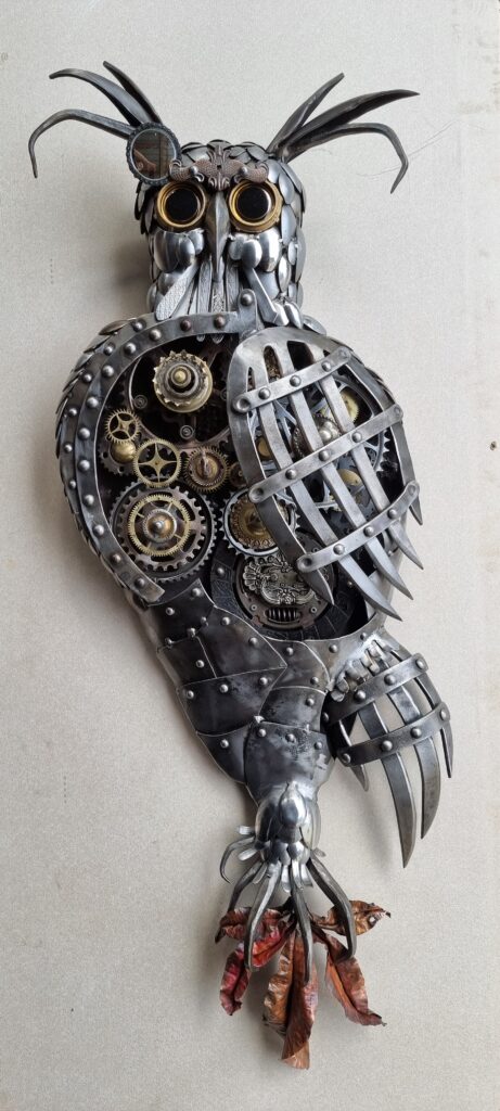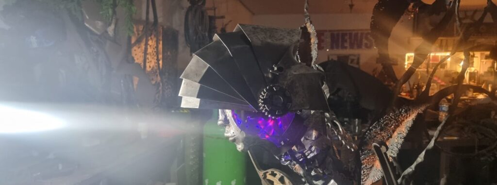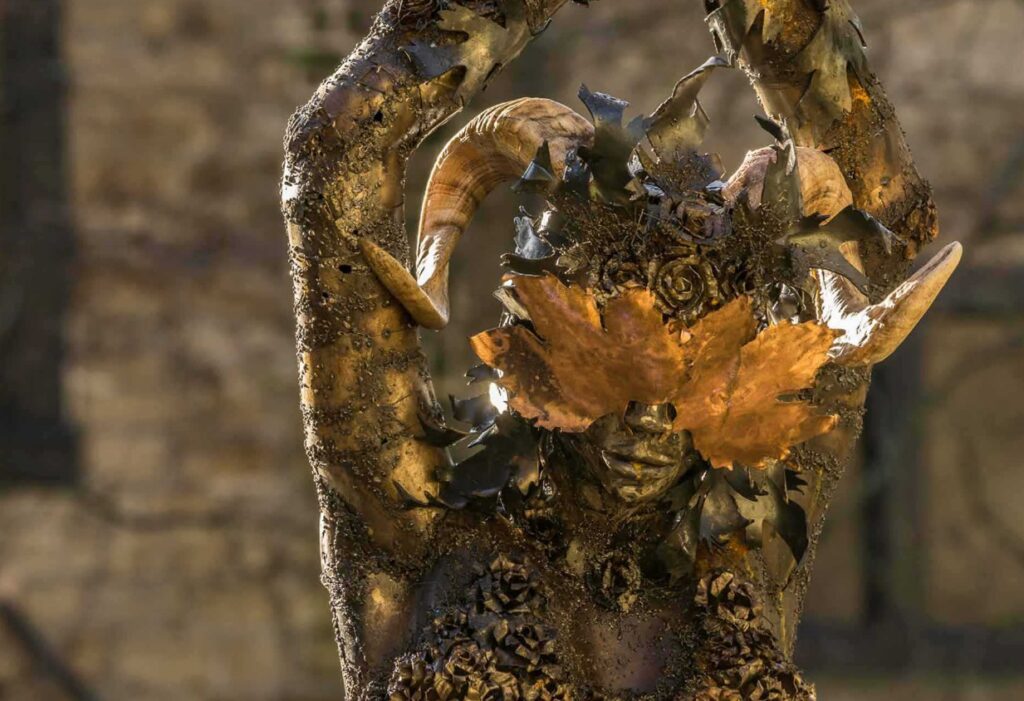 Ronja (pronounced Ronia) is a figurative sculpture embodying mythological and animistic ‘folklore’ themes. Standing at 8 feet tall, she is engaged in a mesmeric dance, whipping up a whirling dervish of leaves that, from the forest floor, form her gown. Roses congregate her bodice and spring from her elbows and headdress. Ronya is a feminine … Read more